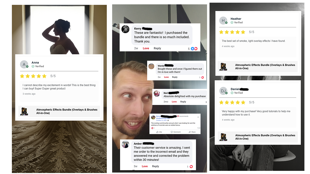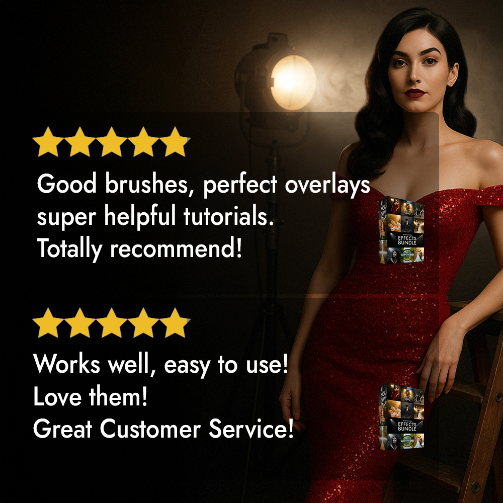 Real-world overlays and brushes, photographed in-studio at 50-megapixel resolution for unmatched realism and edits your audience will instantly love!